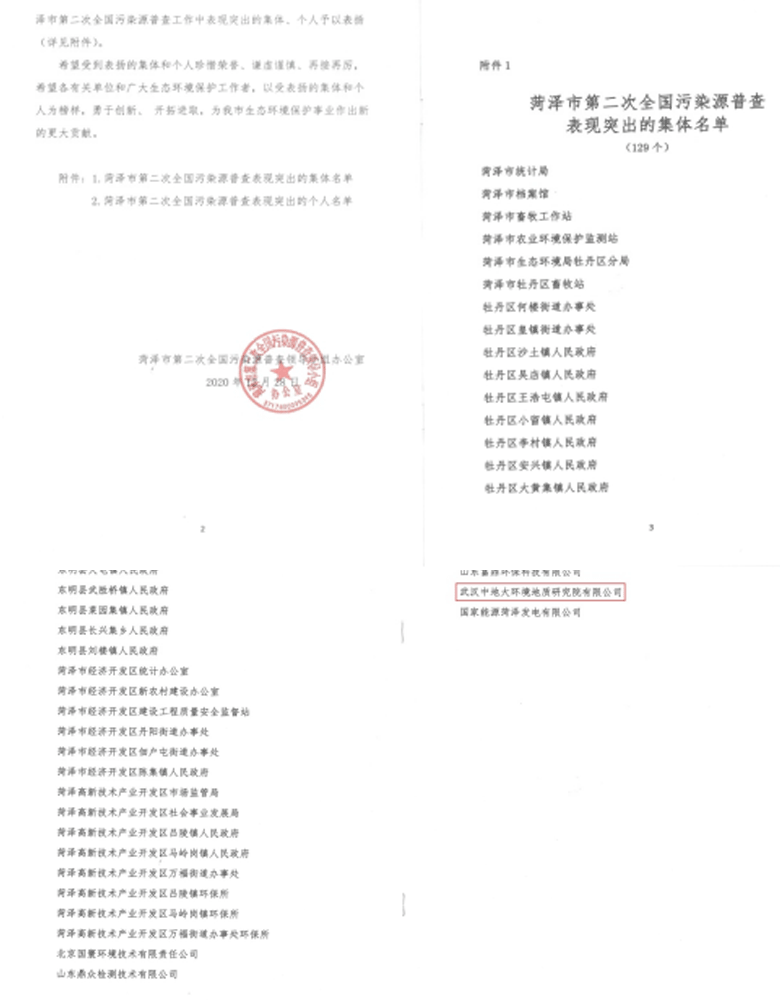公司榮獲“菏澤市第二次全國污染源普查表現突出單位”榮譽來源:武漢中地大環境地質研究院 發布日期:2021-01-15 瀏覽量: