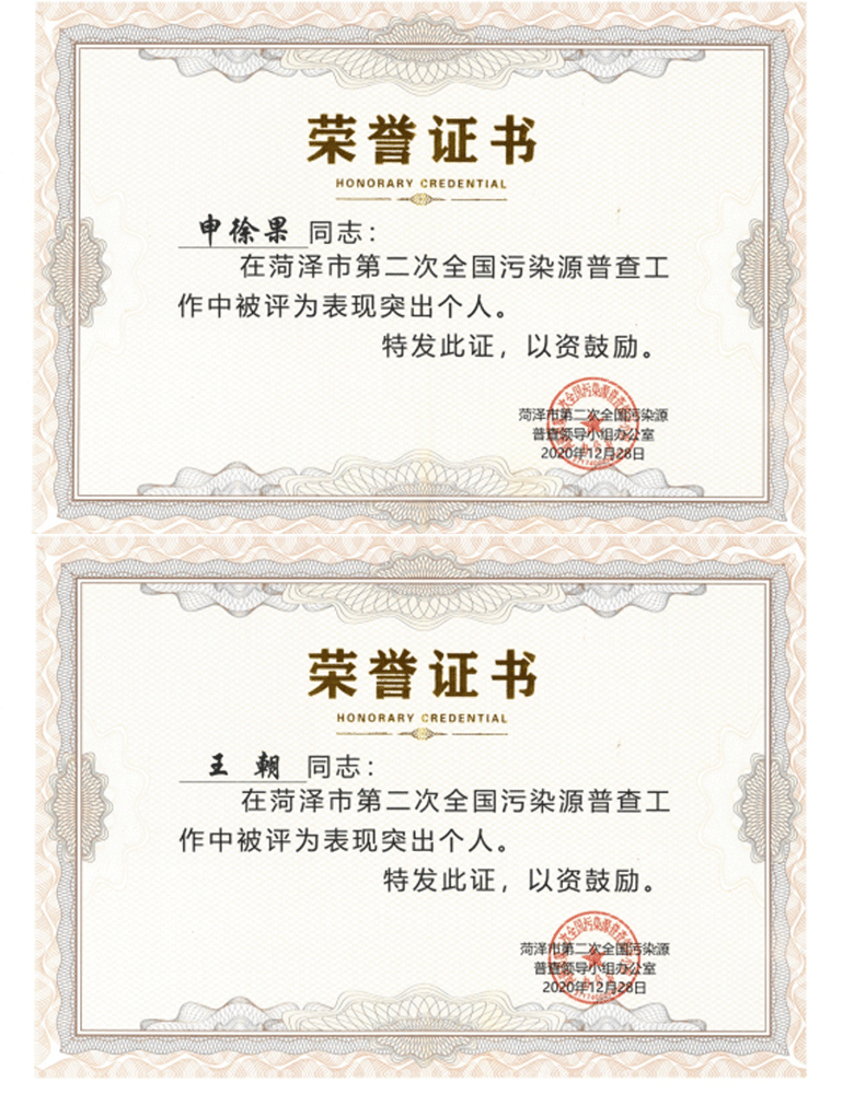 2020年12月,菏澤市第二次全國污染源普查領導小組辦公室發布《關于表揚菏澤市第二次全國污染源普查表現突出的集體和個人的決定》,公司榮獲“表現突出單位”榮譽稱號,申徐果、王朝同志獲得“表現突出個人”榮譽稱號。